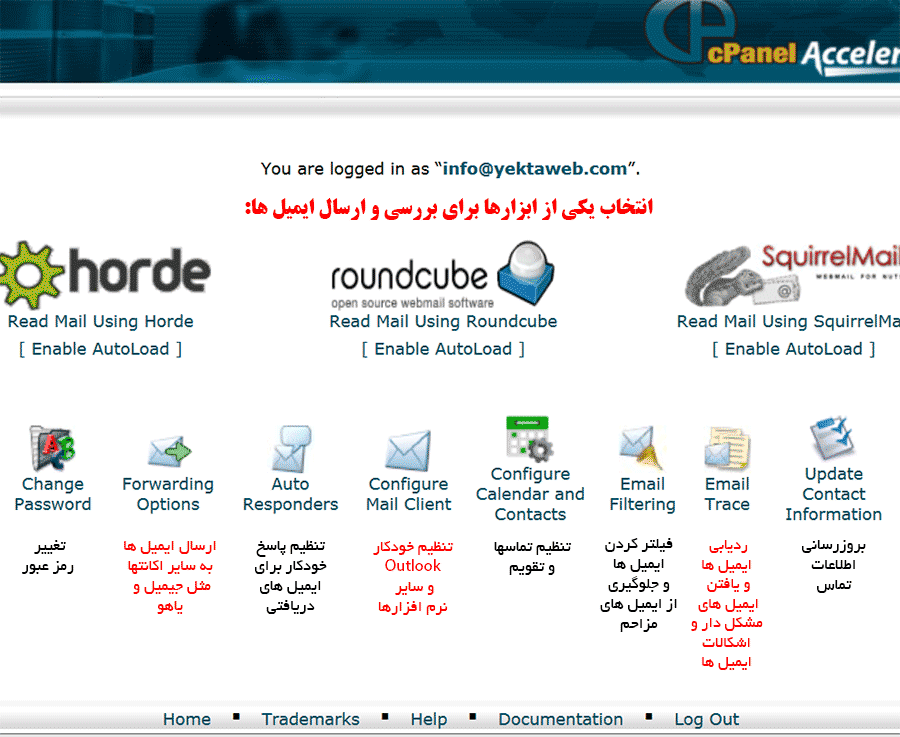 (توجه: اگر سایت خود مثل www.yoursite.com را می بینید ولی نشانی وب میل مثل www.yoursite.com:2095 را مشاهده نمی کنید احتمالا در مسیر دسترسی شما به این نشانی یا این پورت مشکلی مثل فایروال وجود دارد. باید از مهندسین شبکه خود درخواست نمایید موضوع را بررسی کرده و این پورت را باز کنند.)