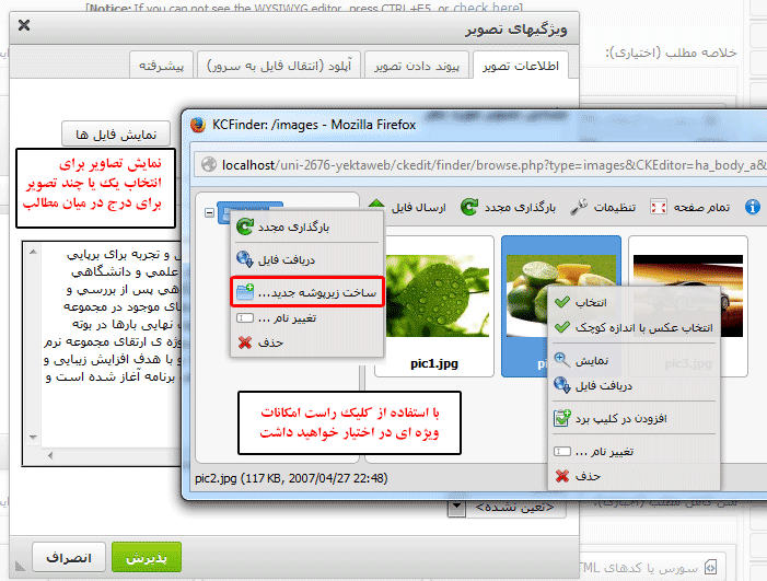 درون پوشه زیربخش شما ایجاد می شود نمایش می دهد. شما می توانید با کمک همین ابزار CKEditor یا ابزار مدیریت پوشه ها و فایل ها، پوشه های بیشتری