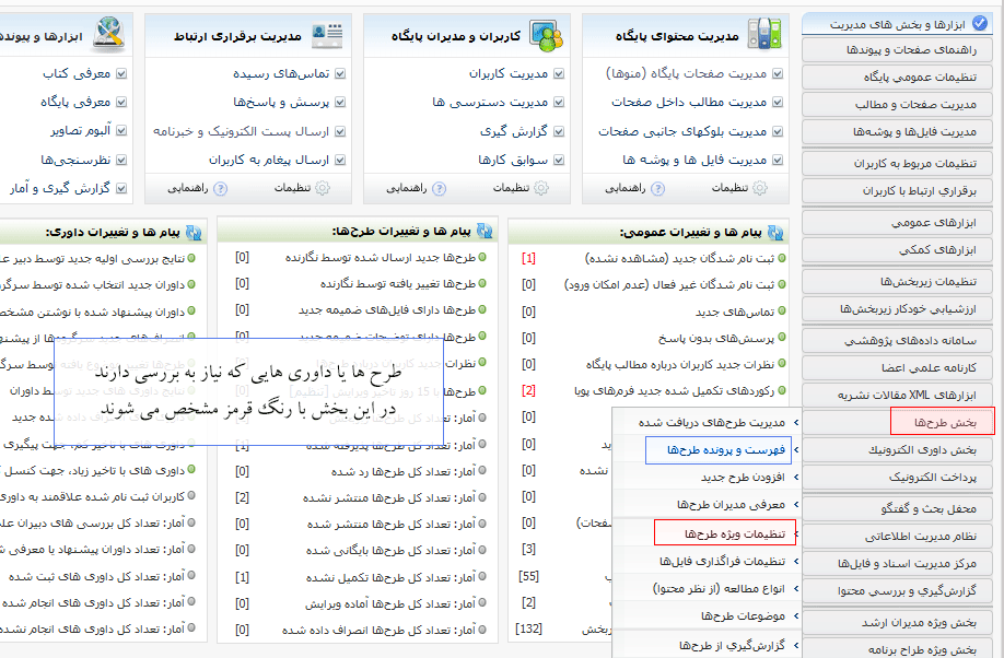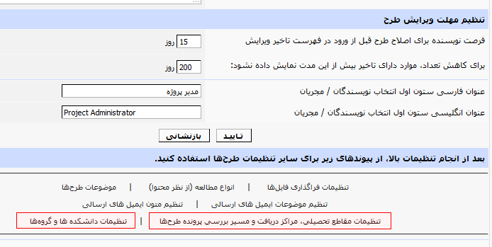 تنظیم و راه اندازی سامانه مدیریت طرح ها مشابه سامانه مدیریت نشریه است. برای استفاده از این سامانه لطفا ابتدا راهنمای بخش نشریات را بررسی کنید. برای یادگیری در نظر داشته باشید که واژه ی مقاله را طرح پژوهشی در نظر بگیرید. سپس مطالب تکمیلی را از بخش زیر مطالعه کنید.