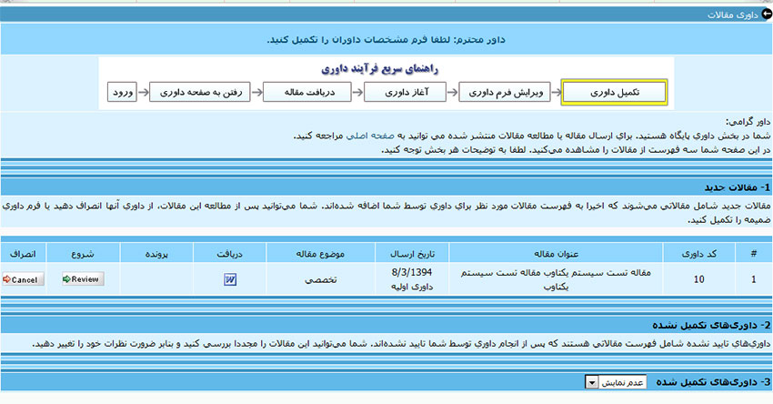 - کلیه مراحل اختیاری هستند و می توان از همه مراحل استفاده نکرد. مثلا مدیر می تواند مقاله را در هر مرحله قبول یا رد کند. امکان تنظیم مراحل فعال مورد نظر از طریق بخش تنظیمات داوری وجود دارد.