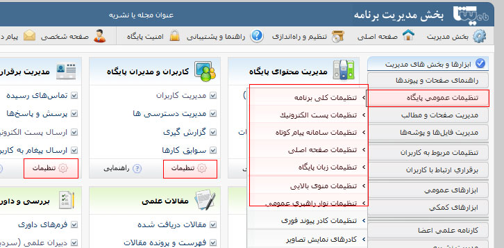 | بخش مقالات | تنظیمات ویژه مقالات | تنظیم کادرها و امکانات فعال در فرم ارسال مقاله، ارسال ایمیل به کاربر، مراحل بررسی مقالات، وضعیت های مقالات، فایل های اصلی فعال برای ارسال و توضیحات کادرهای ارسال فایل، |